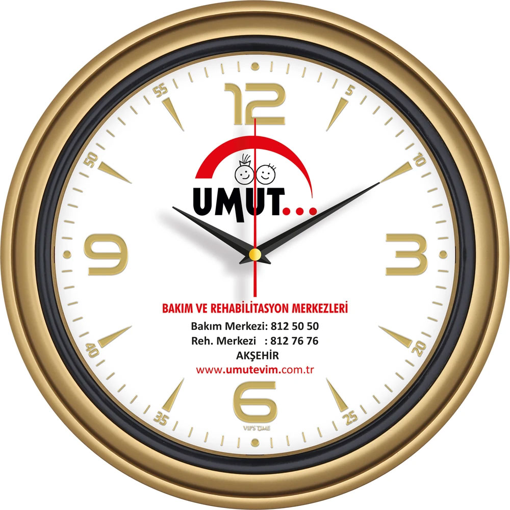 * Ebat: 34 cm * Çerçeve: Plastik * Kadran: Bristol * Saniye: Akar * Cam: Mineral * Baskı: Ofset, Dijital * Koli Adeti: 20 * Not: Altın Varak kadranlar diğer renklerede uygulanabilir. V30-522-AV Plastik Duvar Saati